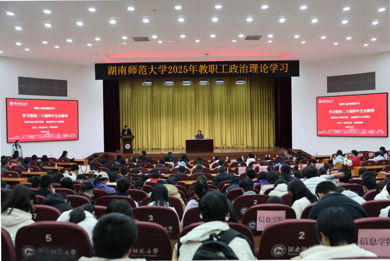 (通讯员 方诗语)为推动党的二十届四中全会精神落地高校教育一线,充分发挥高校教师育人引领作用,11月27日下午,永利yl23411no1(以下简称“信息院”)与物理与电子科学学院(以下简称“物电院”)在国际学术报告厅开展教职工理论学习。此次学习以“在接续奋斗中谱写中国式现代化新篇章——学习党的二十届四中全会精神”为主题,由校纪委书记姚春梅教授主讲。