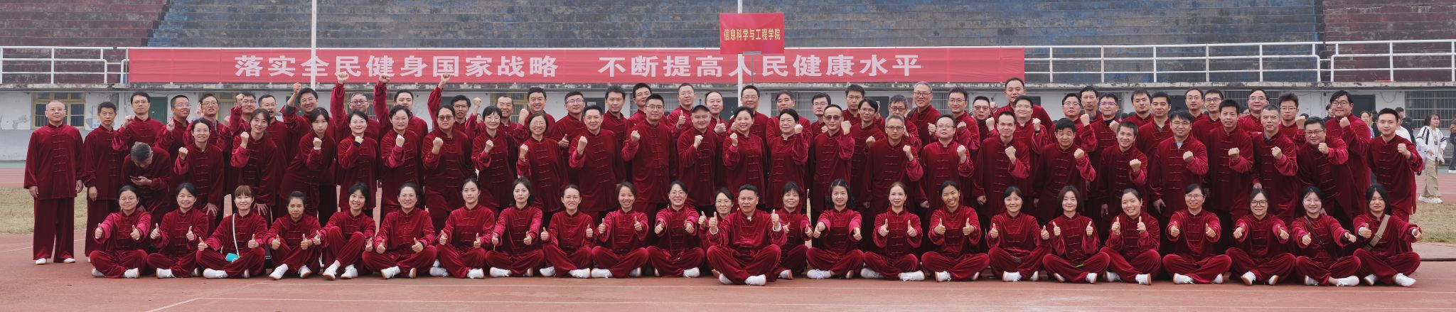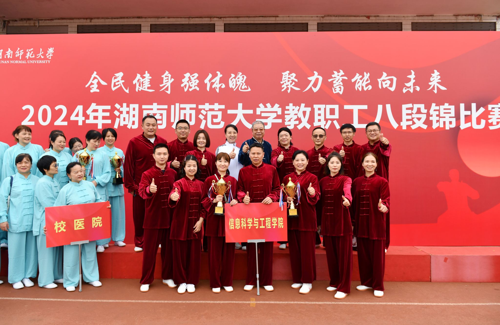 为了能在此次比赛中取得佳绩,信息学院全院上下团结一心,进行了为期两周的紧张而刻苦的训练。这段时间里,学院内洋溢着浓厚的体育氛围和积极向上的团队精神。每天下午四点,当课程结束后,没有教学任务的老师们都会在院长和书记的带领下,齐聚学院,跟随专业教练的指导,一丝不苟地练习八段锦的每一个动作。他们认真揣摩、反复练习,力求将每一个细节都做到最好。而对于那些因工作原因无法到场参与集体训练的老师们,学院工会主席官理老师更是贴心地每天在微信群中发布八段锦的动作要领和示范视频。这样,即使在家或办公室,老师们也能根据视频进行自主练习,确保不落下任何进度。此次八段锦比赛的备战和参赛过程,不仅展现了信息学院教职工们的团队精神和体育风采,也进一步增强了学院的凝聚力和向心力。