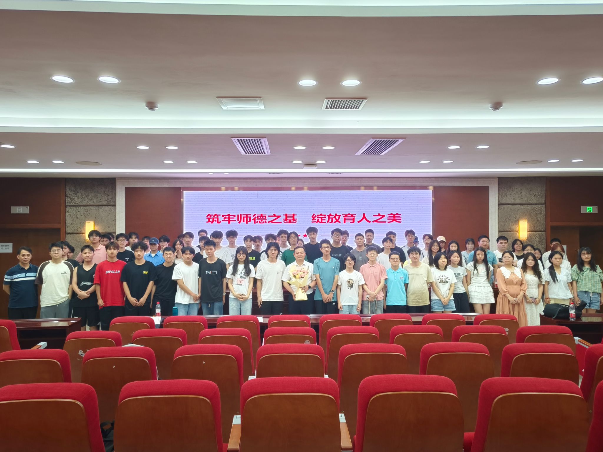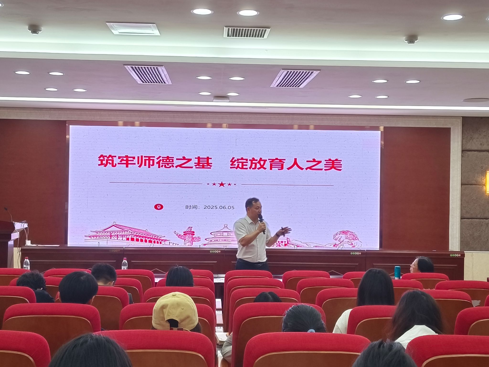 许书记的报告题目是《筑牢师德之基,绽放育人之美》,该报告主要分成三部分:新时代下的师德师风;违反师德师风的具体表现;新时代师德师风十项准则。在报告中,许书记重点阐述了“四有”好教师,“四个引路人”,“四个相统一”的具体含义,以及教育家精神的内涵,列举了违反师德师风的一些具体表现,特别是剖析了“浙江瑞安某小学教师惩戒失当事件”等社会关注热点的师德师风案例,给同学们带来了很大的震撼,也更加意识到了师德师风的重要性。