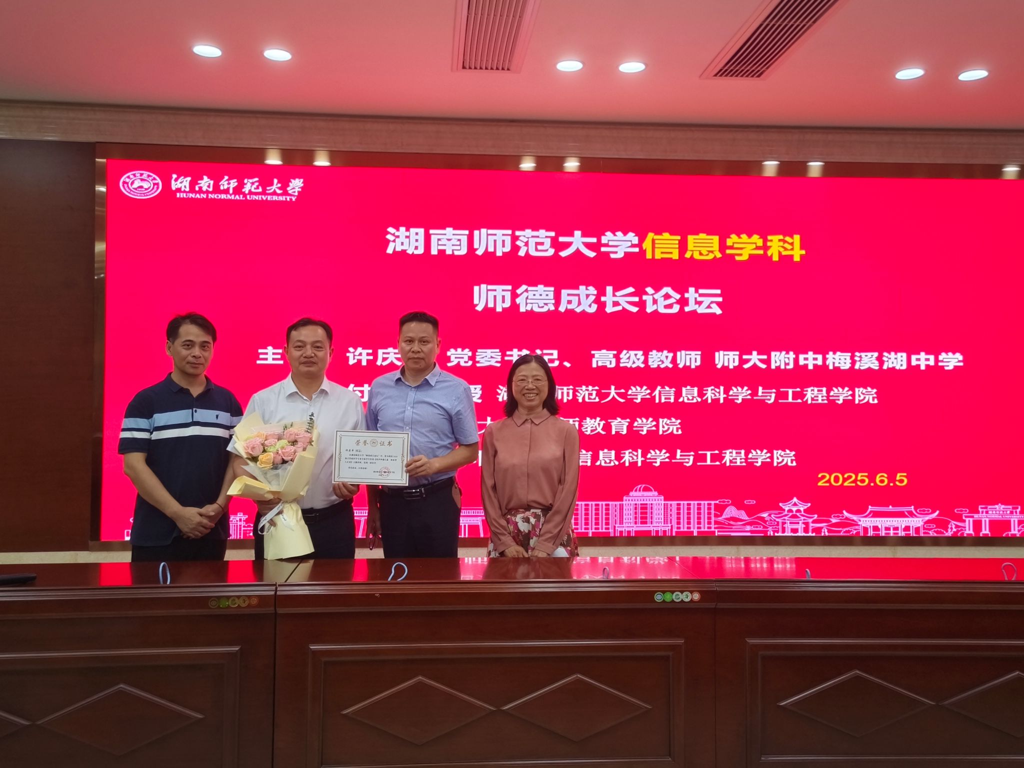 (通讯员 付玉 徐鹏飞报道)2025年6月5日晚上,中和楼智信讲堂灯火辉煌,永利官网与教师教育学院共同举办的“信息学科师德成长论坛”在此隆重举行。该论坛是信息学科(师范方向)本科生的必修课程《教师职业道德与专业发展》教学环节的最后一个部分,旨在从中学名师的角度,解读信息学科教师的职业道德与专业发展之路。本次论坛由付玉教授主持,学院党委副书记周劲松老师致欢迎词,师大附中梅溪湖中学党委书记、高级教师许庆丰老师做主题报告。