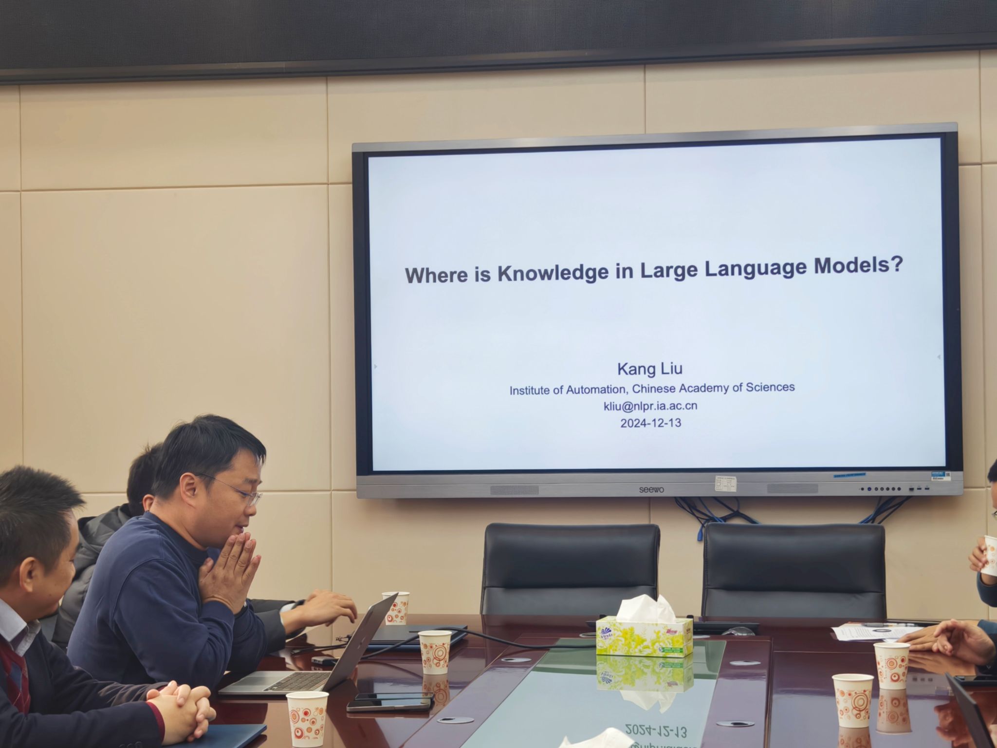 在第一场学术报告中,刘康老师为大家带来了关于大语言模型(LLMs)中知识存储与分析的前沿研究。他深入探讨了LLMs如何从海量数据中汲取知识,以及这些隐性知识与知识图谱中的符号知识之间的关联。阐释了知识定位在LLMs中的重要性,为理解LLMs中的知识结构提供了新的视角。这场报告不仅为我们揭示了LLMs的内在工作机制,也为未来的研究指明了方向。