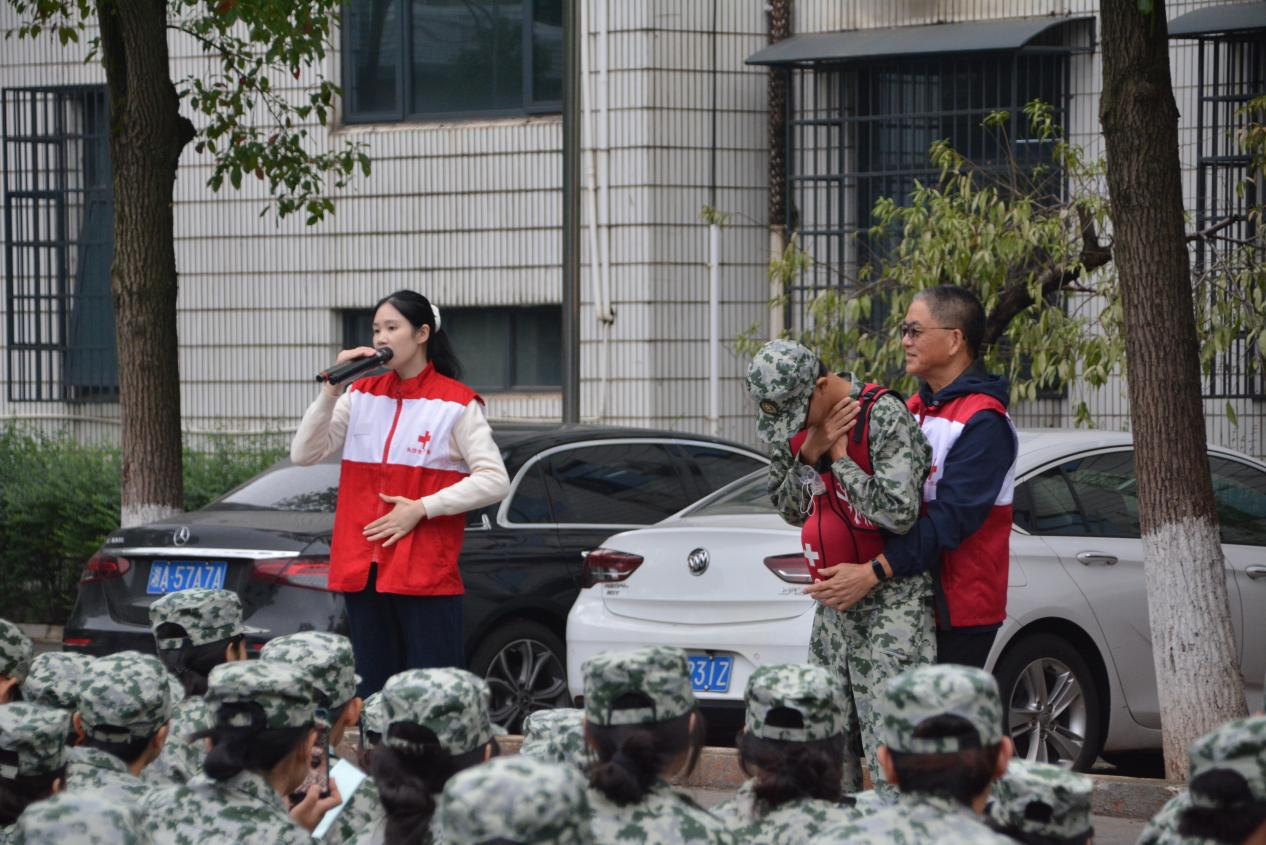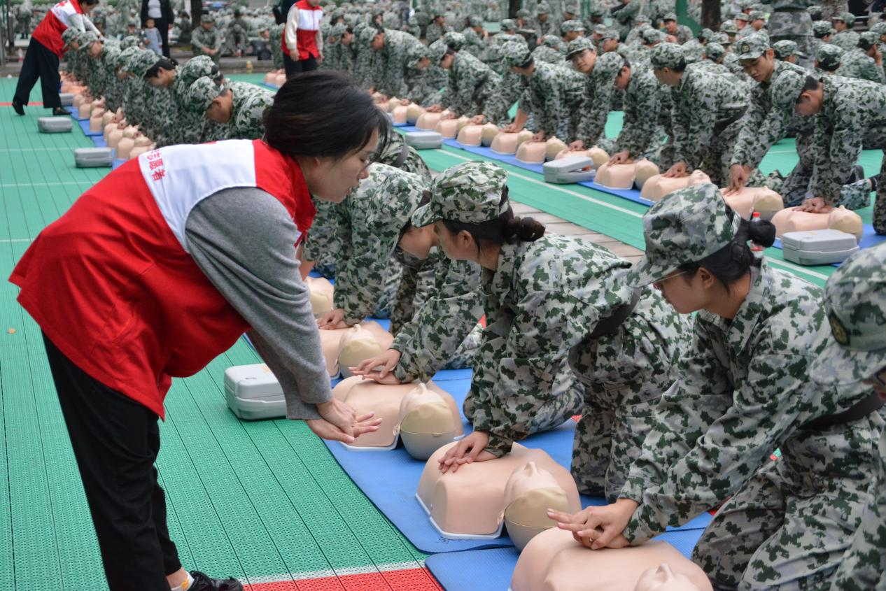 活动现场,长沙红十字会志愿者通过理论讲解与实操演示相结合的方式,依次为各新生方阵讲解海姆立克急救法、心肺复苏、AED使用等急救技能。志愿者在模拟人身上演示操作流程,并讲解动作要点。随后,各方阵新生依次进行实操练习,志愿者在旁逐一指导纠正。参与活动的新生表示,通过分方阵开展的实操练习,使他们更清晰地掌握了急救动作的细节,对有关急救技能的学习更有信心。